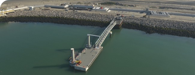 L’assemblage du ponton, opération délicate s’il en est, s’est fait le lendemain de son arrivée et a nécessité plusieurs heures de travail. Le ponton est, en effet, non pas fixé mais coulissé sur deux pieux. Il a donc fallu procéder à la fixation du ponton aux pieux grâce à des colliers de guidage. Cette opération réalisée, les passerelles d’accès au ponton ont pu être installées. Encore quelques travaux et quelques essais à réaliser et le ponton sera prêt pour la mise en service du terminal méthanier.