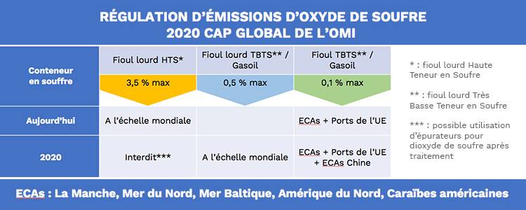Au niveau maritime, la mise en place par l’OMI (Organisation Maritime Internationale) au 1er janvier 2015 d’une limite aux émissions d’oxydes de soufre (SOx) de 0,1 % dans une zone maritime couvrant la mer Baltique, la mer du Nord et la Manche ainsi que tous les ports de l’Union Européenne et de 3,5 % sur le reste des eaux internationales, au travers de la convention MARPOL, avait suscité de véritables espoirs de voir se multiplier le nombre de navires fonctionnant au GNL. Le transport maritime est responsable selon l’AIE (Agence Internationale pour l’Energie) d’environ 2,11 % des émissions mondiales de CO2 et de 7 % des émissions de NOx