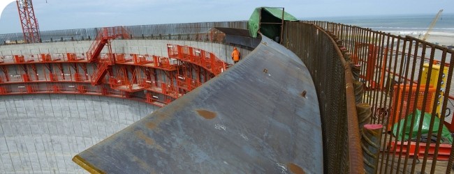 Cette vigilance est d’autant plus importante que le consortium a commencé une partie délicate des travaux sur le Réservoir 1. Le montage des murs (voiles) est désormais quasi-terminé. BOUYGUES TRAVAUX PUBLICS a donc livré la zone à ENTREPOSE PROJETS pour que l’entreprise puisse y poser au sommet (à 38 m environ) l’anneau de compression métallique. Cette tôle circulaire, fixée au béton par des ancrages (goujons), permettra de réceptionner le dôme du réservoir, composé de 29 « pétales » métalliques soudés les uns aux autres. Ce dôme sera monté jusqu’en haut des voiles par soufflage d’air par le dessous. L’anneau de compression métallique servira également à fixer en partie supérieure la « nappe » de métal (liner) qui tapissera l’intérieur du réservoir en béton.